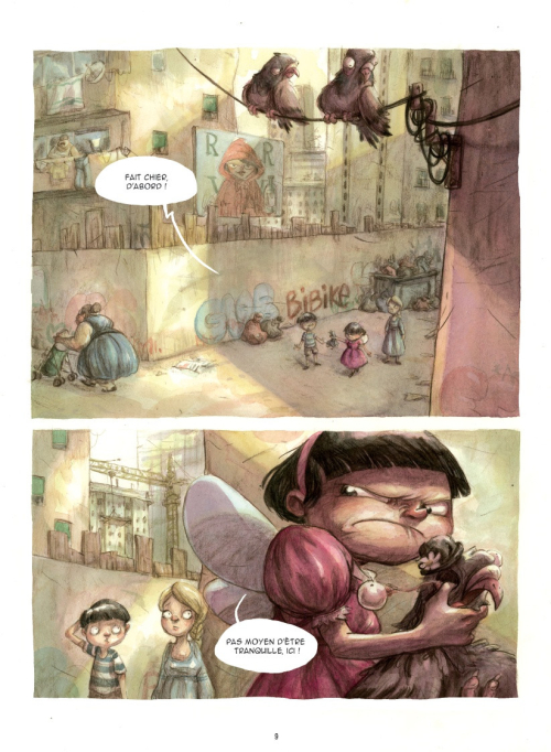 Prolongement de Un léger bruit dans le moteur (d’après un roman de Jean-Luc Luciani, qui se passait à la campagne), Un léger bruit sous le palais est un véritable conte de fée : cru, absolument pas naïf, sanguinaire et avec une morale (et qui se passe, cette fois-ci, en ville). Jonathan Munoz, qui illustre les deux premières pages, passe le relai à Étienne Friess avec délicatesse. Leurs deux univers graphiques se mélangent pour dérouler l’intrigue noire à souhait de Gaet’s. On suit ainsi les péripéties machiavéliques de cette fée rose (elle a de jolies ailes dans son dos) qui ne rate pas une occasion de tuer son prochain et à qui tout le monde laisse une entière latitude. Et puis, grâce à son phrasé de petite enfant, on entre dans sa tête, à la fois témoins et acteurs. Le scénariste de R.I.P. s’offre même un petit hommage à sa brillante série au moment de faire sortir quelques cadavres au sens propre comme au sens figuré de cet immeuble. Une histoire sombre et froide, et paradoxalement réjouissante.