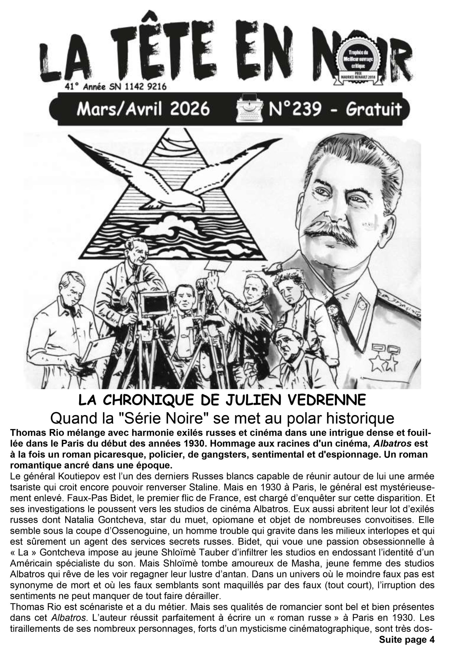 Au sommaire de ce numéro 237 : « La Chronique de Julien Védrenne » (Albatros, de Thomas Rio & La Mort malgré lui, d’Armelle Hérisson), « La Chronique de Michel Amelin » (Hantise, de Heather Graham, Au seuil de l’abîme, de Hake Talbot & Échos, de Richard Matheson), « Documentation noire et policière » (Le Roman policier, de Roger Caillois), « Entre quatre planches : la sélection de Frédéric Prilleux » (Au sud, l’agonie, de Pelaez & Labiano & Bleu de chauffe, de Chouin), « Le roman noir du mois par Jean-Paul Guéry » (La Colline, de Mathilde Beaussault), « Les Rencontres à la librairie Lhériau » (Colombe Schneck, Pierre Lemaitre, Laure Manel, Clarisse Sabard & Thimothée de Fombelle), « Le Bouquiniste a lu » (Tape-cul, de Joe R. Lansdale & Qui veut la peau de Roger Rabbit ?, de Gary K. Wolf), « Le Choix de Christophe Dupuis » (Sombres plantations, de Nilima Rao), « Aux frontières du noir », d’Alain Régnault (Cathédrale, de Tarik Noui), « Prix Mystère de la Critique 2026 », « La Page de Jean-Marc Laherrère » (Les Disparus d’As Covas, de Susana Fortes & Une espèce en voie de disparition, de Lavie Tidhar), « Dans la bibliothèque à Pépé » (Le Passager du bac, de Roger Faller), « En bref… » (Continuons le début, de Marc Villard, Le Diable, tout le temps, de Donald Ray Pollock, Mémoires sauvées du vent, de Richard Brautigan & L’Affaire Eugène Weidmann, de Cyril Gay), « Artikel Unbekannt dissèque pour vous » (Respiration de la haine, de Kââ), « Y’a pas que le polar dans la vie » (Vie d’O.-G. Gaillard, de Christophe Ségas, Comédie française, de Charlie Jegonday, Ceux qui ne sont rien, de Patricia Melo & La Classe et la fonction, de Mariana Alves), « Les (Re)découvertes de Gérard Bourgerie » (Jours de crimes, de Pascal Robert-Diard & Stéphane Durant-Soufflant).